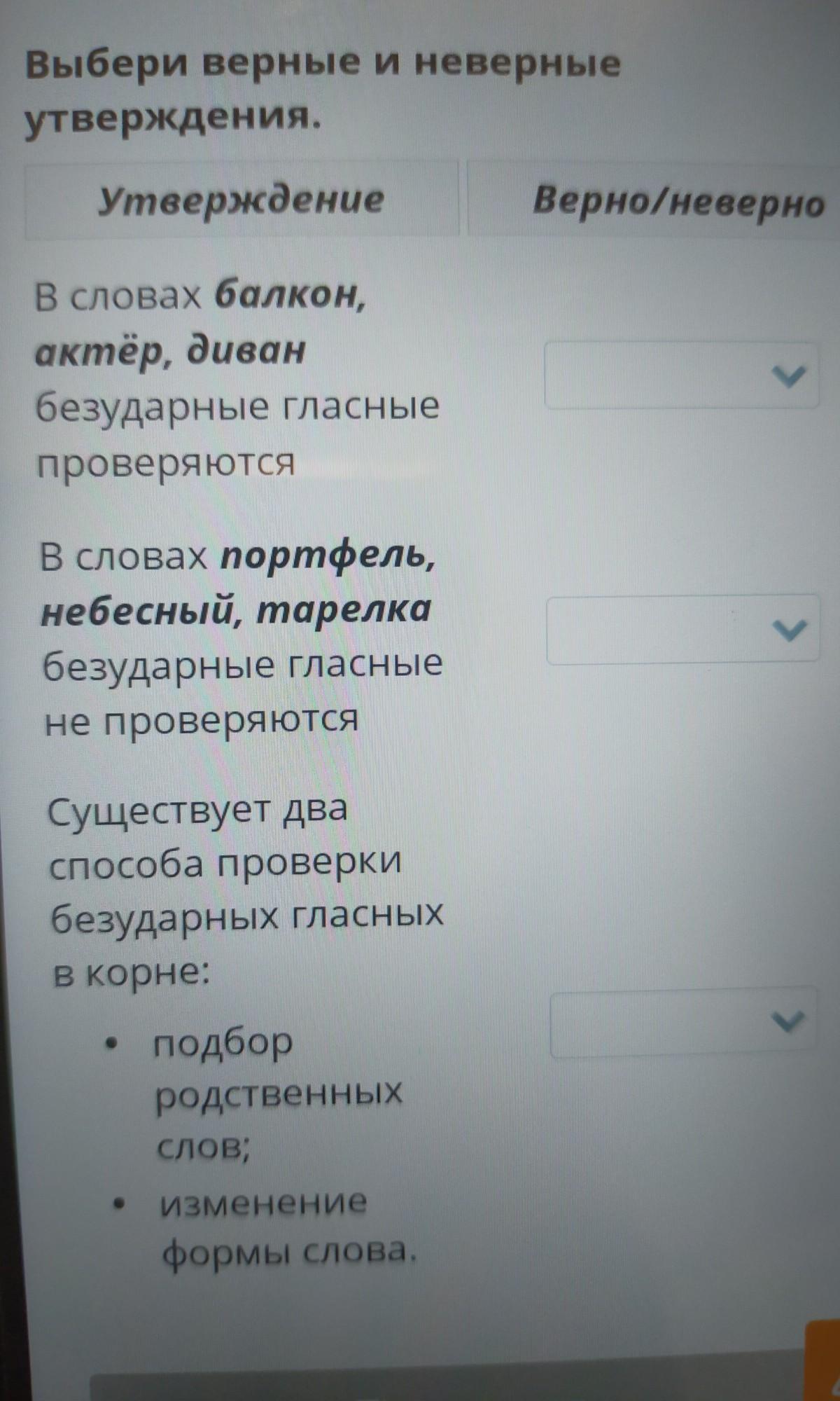Знаю и применяю. Урок 2 Выбери верные и неверные утверждения. Утверждение Верно/неверно В словах балкон, актёр, диван безударные гласные проверяются В словах портфель, небесный, тарелка безударные гласные не проверяются Существует два способа проверки безударных гласных в корне: подбор родственных слов; изменение формы слова. . .
