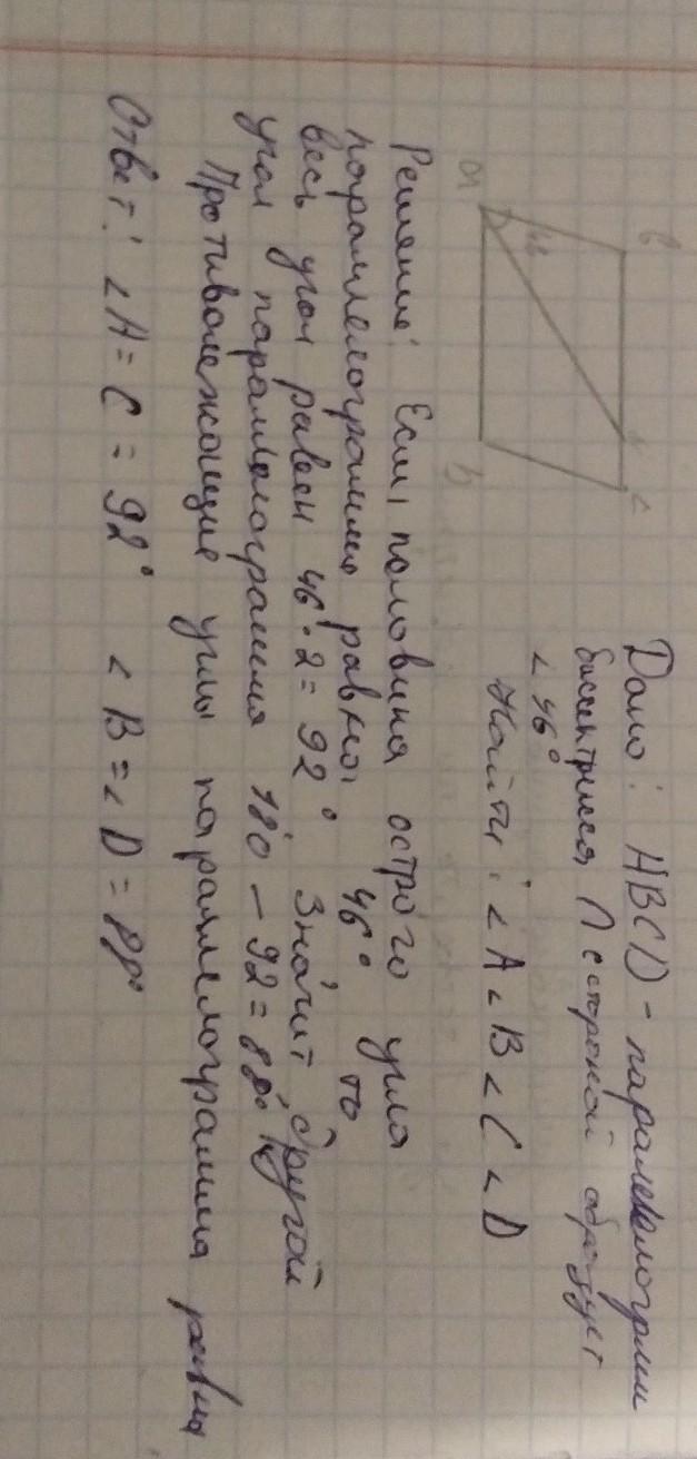 Решение:Если половина острого угла паралелограмма равна 46° то весь угол паралелограмма равен 46*2=92°.значит другой угол паралелограмма 180-92=88°. Противолежашие стороны равны.