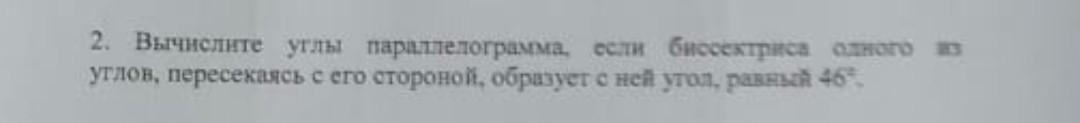 Вычислите углы параллелограмма, если биссектриса одного углов, пересекаясь с его стороной, образует с ней угол. равный 46°