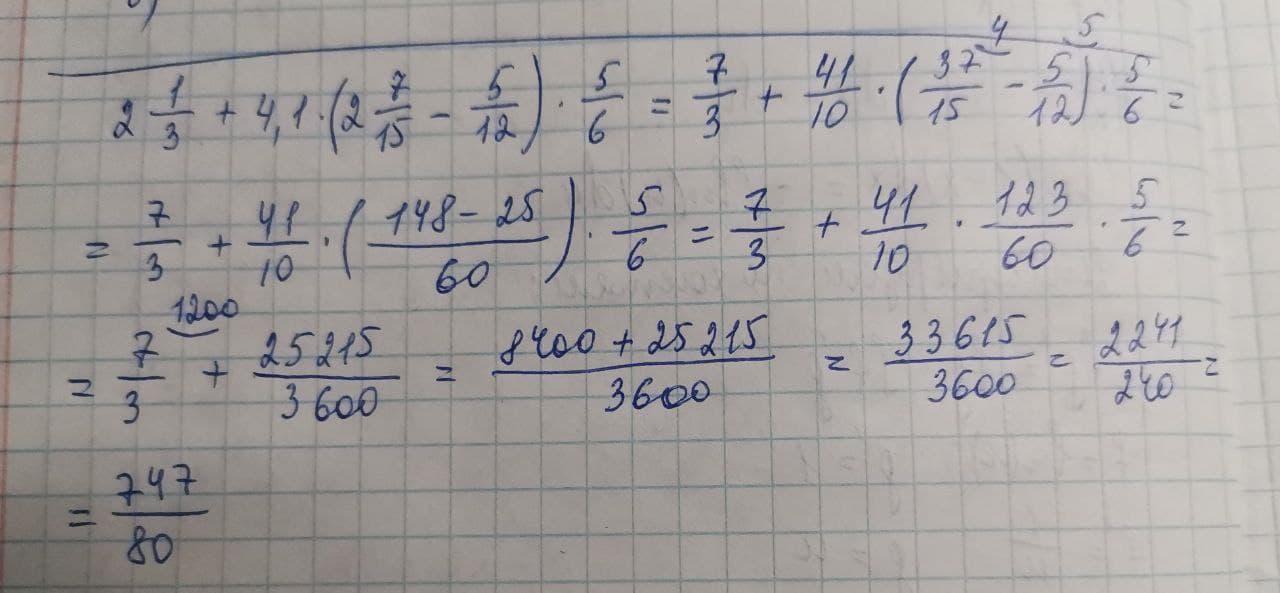 1.Найдите значение выражения: 2 1/3 + 4, 1(2 7/15 - 5/12) * 5/6