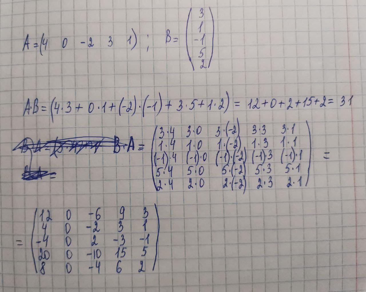 А*B=(4*3+0*1+(-2)*(-1)+3*5+1*2)=12+0+2+15+2=31