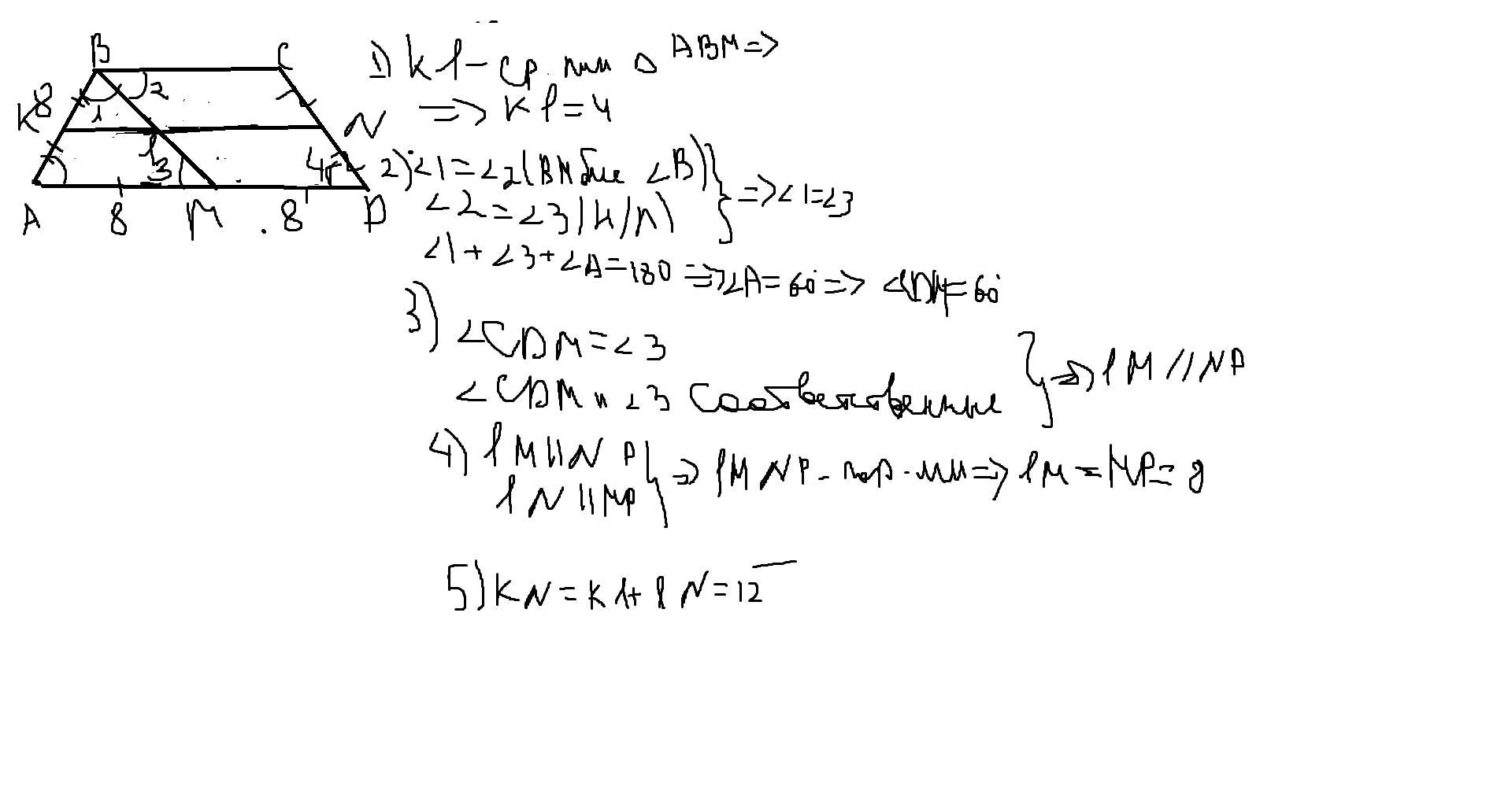 В равнобокой трапеции с тупым углом 120 биссектриса этого угла делит большое основание,равное 16 см пополам.Найдите среднюю линию трапеции