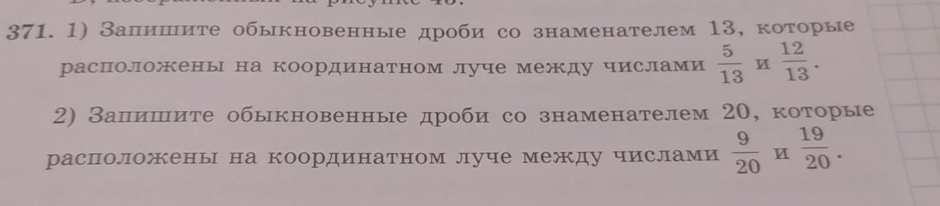13 371. 1) Запишите обыкновенные дроби со знаменателем 13, которые расположены на координатном луче между числами 5 12 И 13 2) Запишите обыкновенные дроби со знаменателем 20, которые 9 19 расположены на координатном луче между числами 20 20 И.