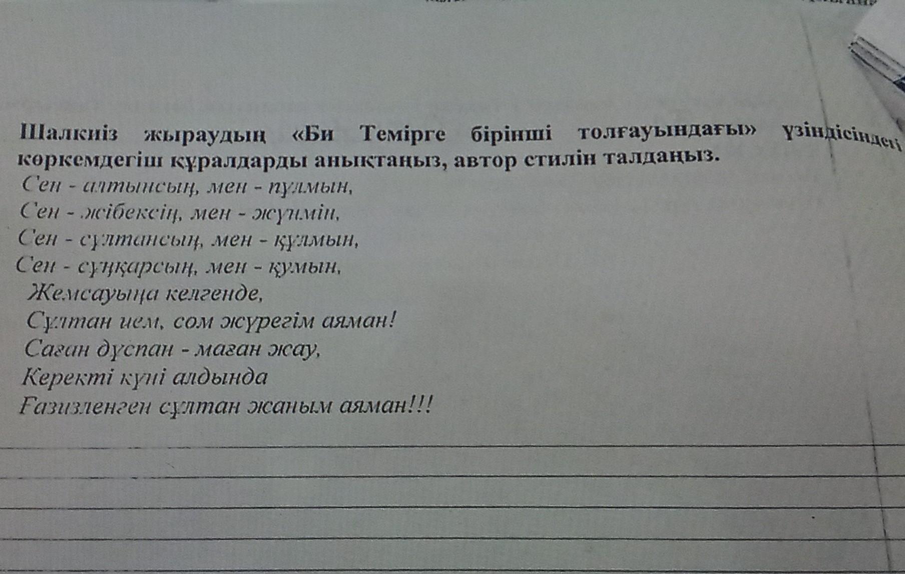 Шалкиіз жыраудың «Би Темірге бірінші толғауындағы» үзіндісіндегі көркемдегіш құралдарды анықтаңыз, автор стилін талдаңыз