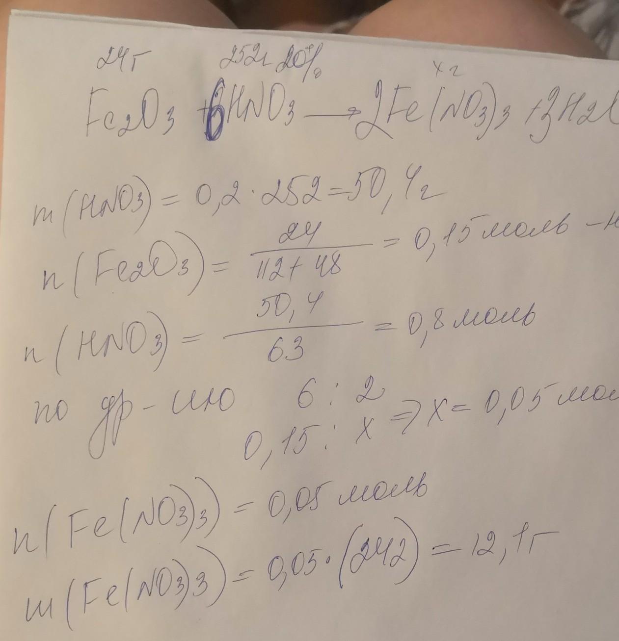 рассчитайте массу соли, полученной при взаимодействии оксида железа 3 массой 24 г со 252 г 20% раствора азотной кислоты