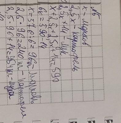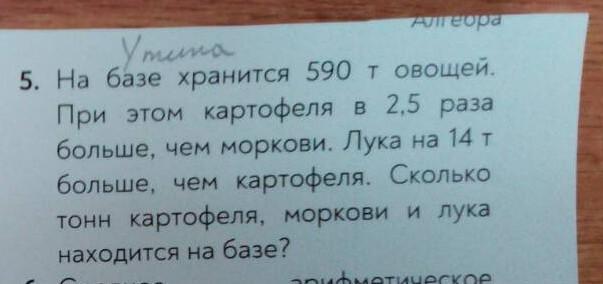 Всего овощей на базе было х+2,5х+2,5х+14 кг, что по условию задачи равно 590 кг.
