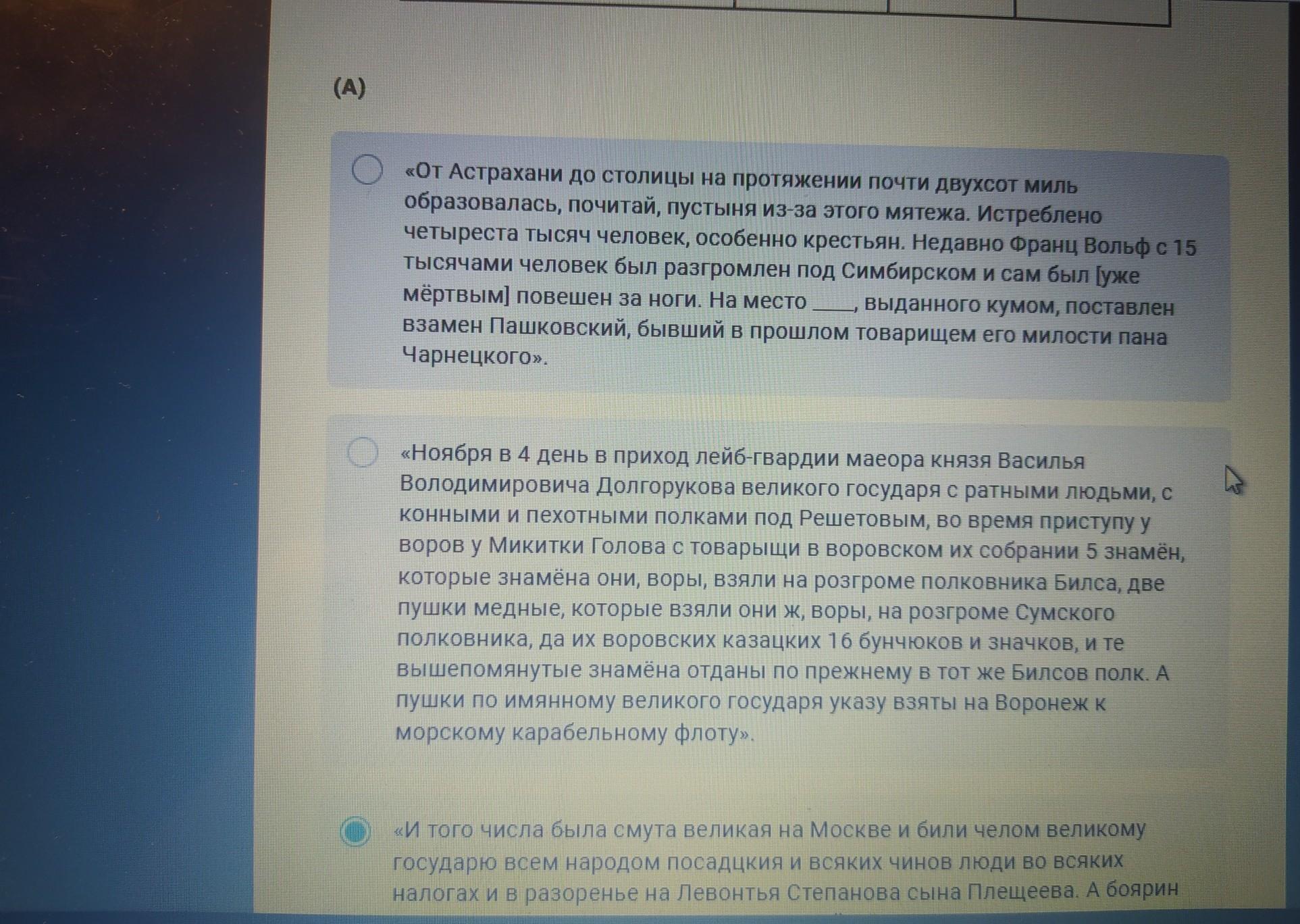«От Астрахани до столицы на протяжении почти двухсот миль образовалась, почитай, пустыня из-за этого мятежа. Истреблено четыреста тысяч человек, особенно крестьян. Недавно Франц Вольф с 15 тысячами человек был разгромлен под Симбирском и сам был [уже мёртвым] повешен за ноги. На место ____, выданного кумом, поставлен взамен Пашковский, бывший в прошлом товарищем его милости пана Чарнецкого».