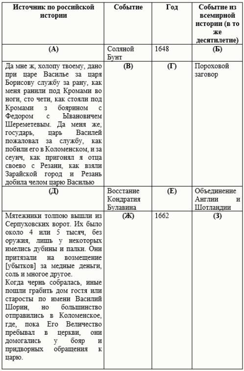 Определите пропущенные в таблице описания событий истории России, их названия, годы, когда они происходили, и события из всеобщей истории, произошедшие в то же десятилетие. Обратите внимание на то, что среди предлагаемых вставок есть «лишние» элементы.