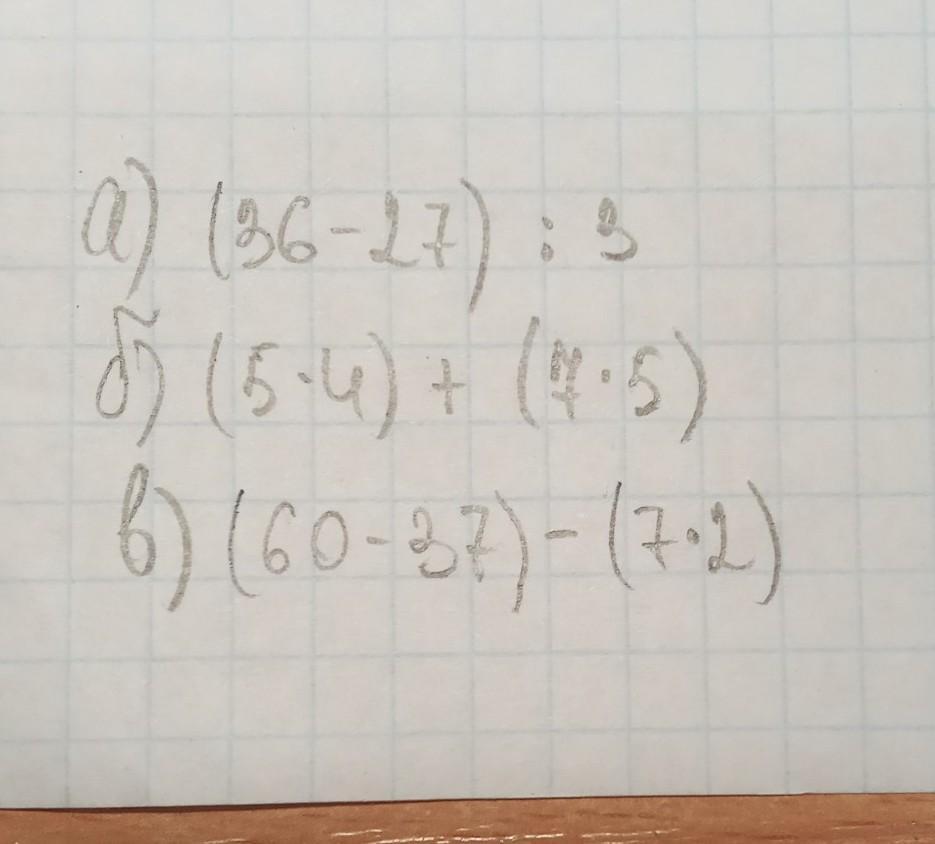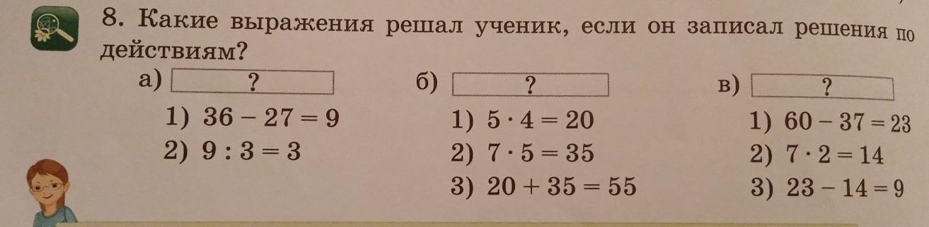 8. Какие выражения решал ученик, если он записал решения по действиям? а) Е ? б) ? в) ? 1) 36 -27= 9 1) 5.4 = 20 1) 60 - 37 = 28 2) 9:33 2) 7.5 = 35 2) 7.2 = 14 3) 20 + 35 = 55 3) 23 - 14 = 9