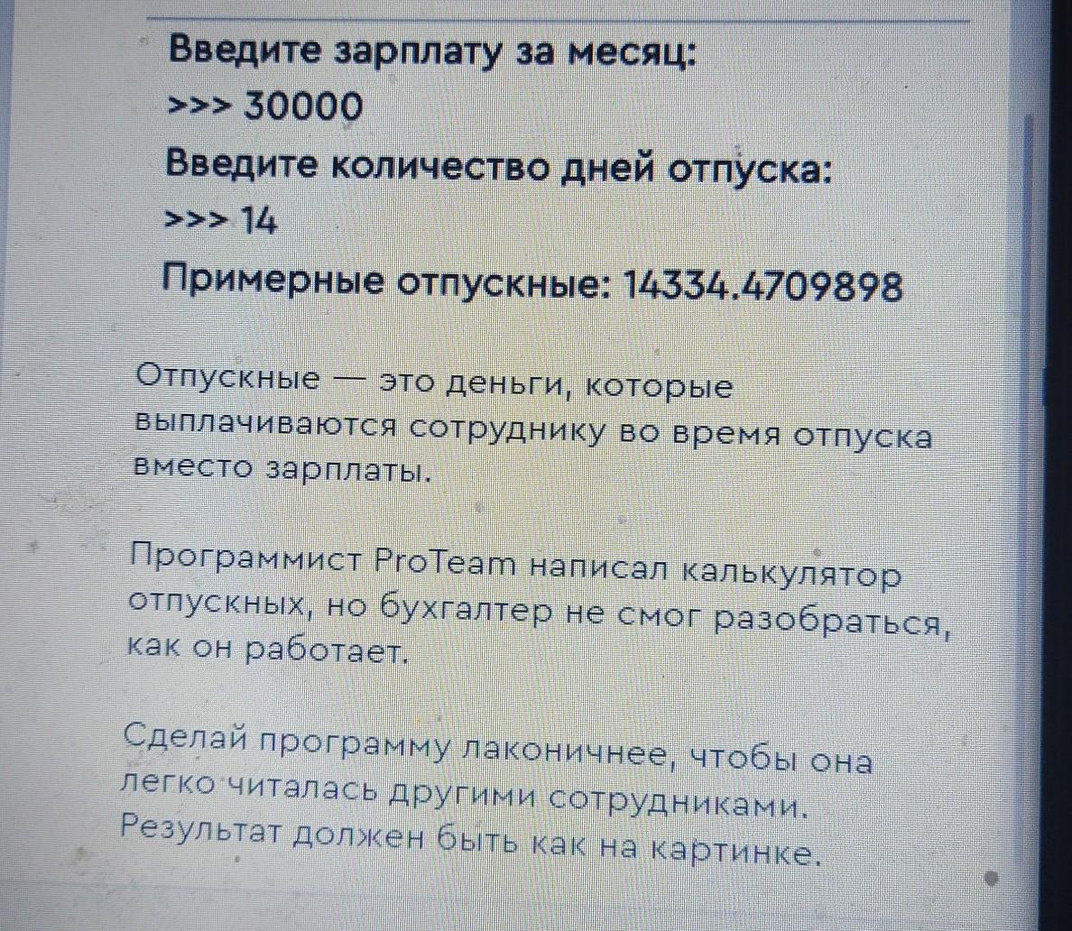 print(f"Отпускные будут равнятся = количество дней отпуска({dni})*((зарплата({zarplata})*12)/12)/29.3\n","Итого, отпускные составят %.7f"%(zarplata/29.3*dni),sep="")