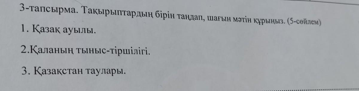 3 - тапсырма . Такырыптардың бірін таңдап , шагын мәтін кұрыныз . ( 5 - сейлем ) 1. Казак ауылы . 2.Каланың тыныс - тiршiлiгi . 3. Казакстан таулары .