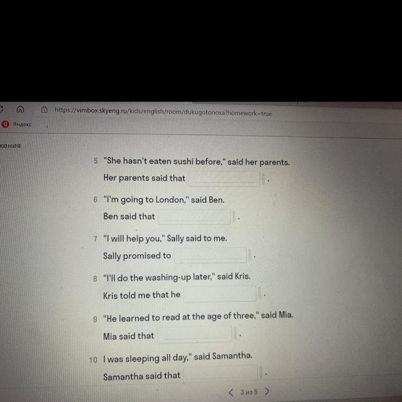 She hasnt eat a sushi before 2He is gone to london 3Help me 4She will do washing-up later 5He has learnt to read at the age of 3 6She was sleeping all the day