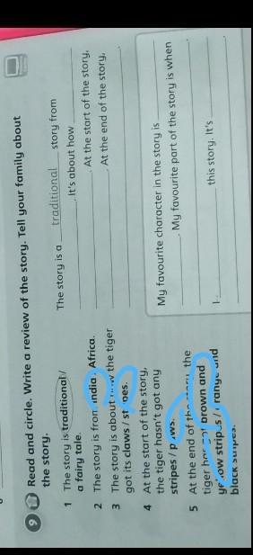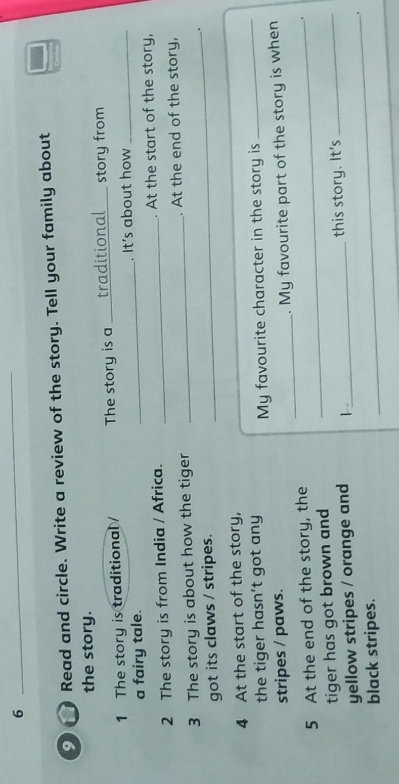Read and circle. Write a review of the story. the story. The story is a traditional story from It's about how 4 At the start of the story, At the end of the story, 12 1 The story is traditional / a fairy tale. 2 The story is from India / Africa. 3 The story is about how the tiger got its claws / stripes. 4 At the start of the story, the tiger hasn't got any stripes / paws. 5 At the end of the story, the tiger has got brown and yellow stripes / orange and black stripes. My favourite character in the story is My favourite part of the story is when this story.