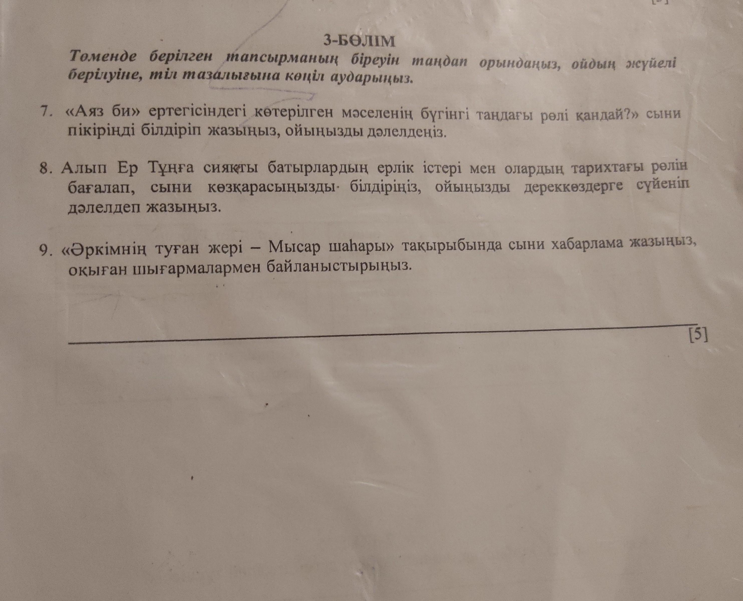 [3] 3-БӨЛІМ Төменде берілген тапсырманың біреуін таңдап орындаңыз, ойдың жүйелі берілуіне, тіл тазалығына көңіл аударыңыз. 7. «Аяз би» ертегісіндегі көтерілген мәселенің бүгінгі таңдағы рөлі қандай?» сыни пікірінді білдіріп жазыңыз, ойыңызды дәлелдеңіз. 8. Алып Ер Тұңға сияқты батырлардың ерлік істері мен олардың тарихтағы рөлін бағалап, сыни көзқарасыңызды білдіріңіз, ойыңызды дереккөздерге сүйеніп дәлелдеп жазыңыз. 9. «Әркімнің туған жері – Мысар шаһары» тақырыбында сыни хабарлама жазыңыз, оқыған шығармалармен байланыстырыңыз. [5]