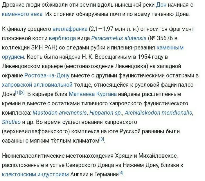 Древние люди обживали эти земли вдоль нынешней реки Дон начиная с каменного века. Их стоянки обнаружены почти по всему течению Дона. К финалу среднего виллафранка (2,1—1,97млн л. н.) относится фрагмент плюсневой кости верблюда вида Рагасатelus alutensis (N® 35676 в коллекции ЗИН РАН) со следами рубки и пиления-резания каменным орудием. Кость была найдена Н. К. Верещагиным в 1954 году в Ливенцовском карьере (местонахождение Ливенцовка) на западной окраине Ростова-на-Дону вместе с другими фаунистическими остатками в хапровской аллювиальной толще, относящейся к русловой фации палео- Дона 12) В карьере близ Матвеева Кургана найдены расщепленные кремни в вместе с остатками типичного хапровского фаунистического комплекса: Мastodon arvernensis, Hipparion sp., Archidiskodon meridionalis, Struthio и др. Во время существования хапровского (верхневиллафранкского) комплекса на юге Русской равнины были саванны с мягким теплым климатом 3] Нижнепалеолитические местонахождения Хрящи и Михайловское, расположенные в устье Северского Донца на Нижнем Дону, близки к клектонским индустриям Англии и Германии4.