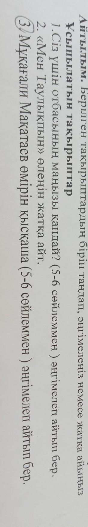 [10] Айтылым. Берілген тақырыптардың бірін таңдап, әңгімелеңіз немесе жатқа айыңыз Ұсынылатын тақырыптар 3. Мұқағали Мақатаев өмірін қысқаша (5-6 сөйлеммен ) әңгімелеп айтып бер.