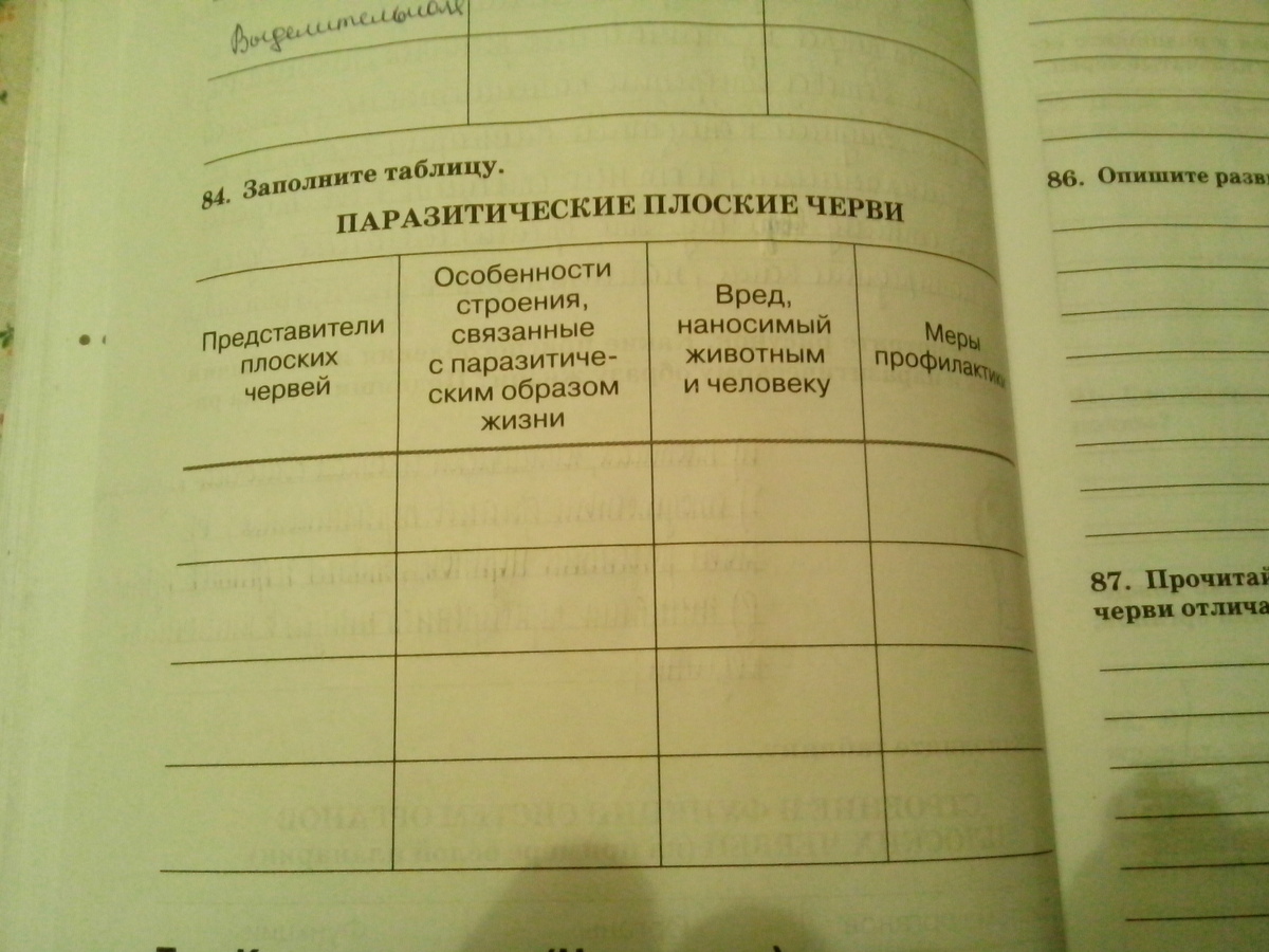 Представители: планарии, печёночный сосальщик, кошачья двуустка, бычий цепень, свиной солитёр,широкий лентец, эхинококк.Особенности строения: тело билатериально-симметричное, с четко выраженными головным и хвостовым концами, несколько уплощенное в дорсовентральном направлении, у крупных представителей — сильно уплощенное.Полость тела не развита (за исключением некоторых фаз жизненного цикла ленточный червей и сосальщиков). Обмен газами осуществляется через всю поверхность тела; органы дыхания и кровеносные сосуды отсутствуют. Вред, наносимый животным и человеку: например:печеночный сосальщик, поразитирует как на животных, так и на человеке. Личинки попадают в человека в основном с употреблением не кипяченой, не фильтрованной воды, проникновение в животных (в часности крупного рогатого скота) осуществляется через употребление травы на не тщательно провереном пастбище.Профилактика: пить только фильтрованную, а лучше кипяченую воду, подвержение растительной пищи тепловой обработке.