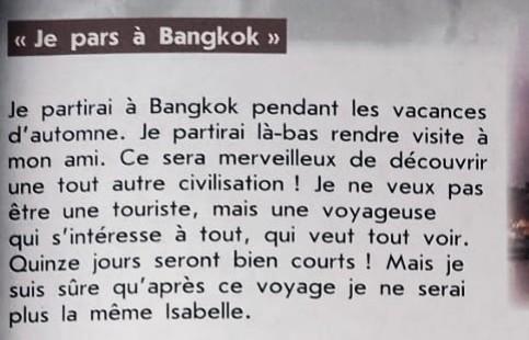 Жё партирЭ а бангкОк па(носовая «а», как будто вы зажали нос)ндАнт ле ваканс дотОмн. Жё партирЭ ля-бас ре(носовая)ндр визИт а мон амИ. Сё сэрА мэрвэйЁ дё дэкуврИ юн ту отр сивилизасьОн ! Жё нё вё па этр юн турИст, мэ юн воуяжЁз ки сантирЭс а ту, ки вё ту вуар. Кянз жур сэрОнт бьа(носовая)н курт! Мэ жё сюи сюр капрЭ сё вуаяж(ж мягкая) жё нё сэрЭ плю ля мэм изабЭль.