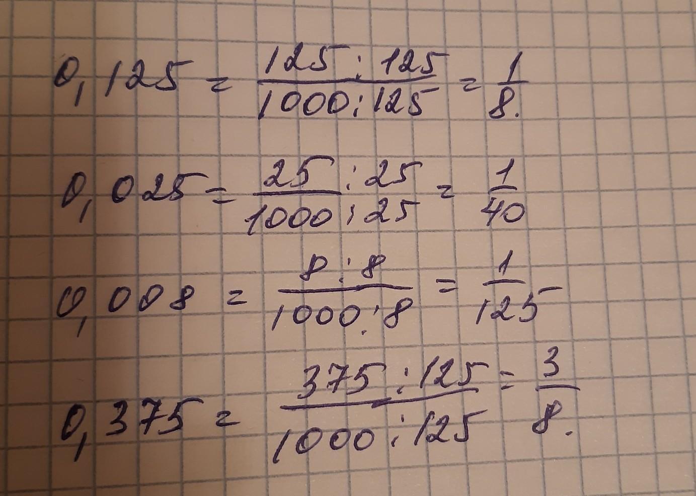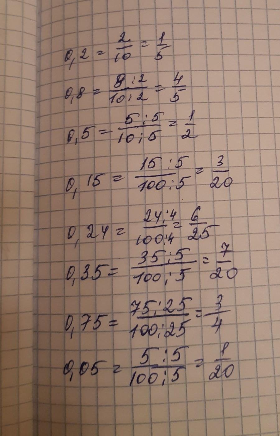 235. Представьте в виде обыкновенной несократимой дроби: 0,2; 0,8; 0,5; 0,15; 0,24, 0,35; 0,75; 0,05; 0,125; 0,025; 0,008; 0,375.