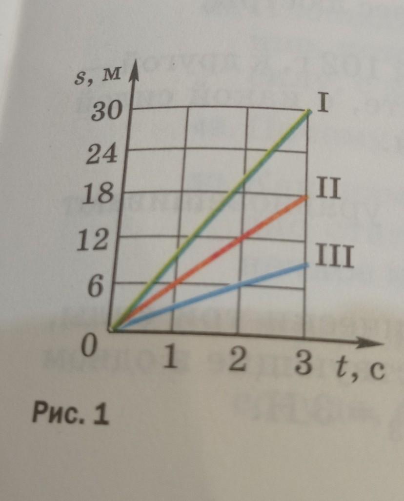 По графику зависимости пути от времени (рисунок 1) определите скорость движения трёх тел