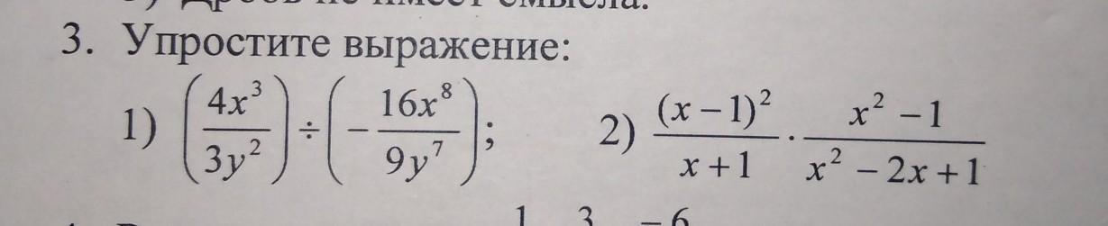 1) (4x^3/3y^2) : ( - 16x^8/9y^7) =