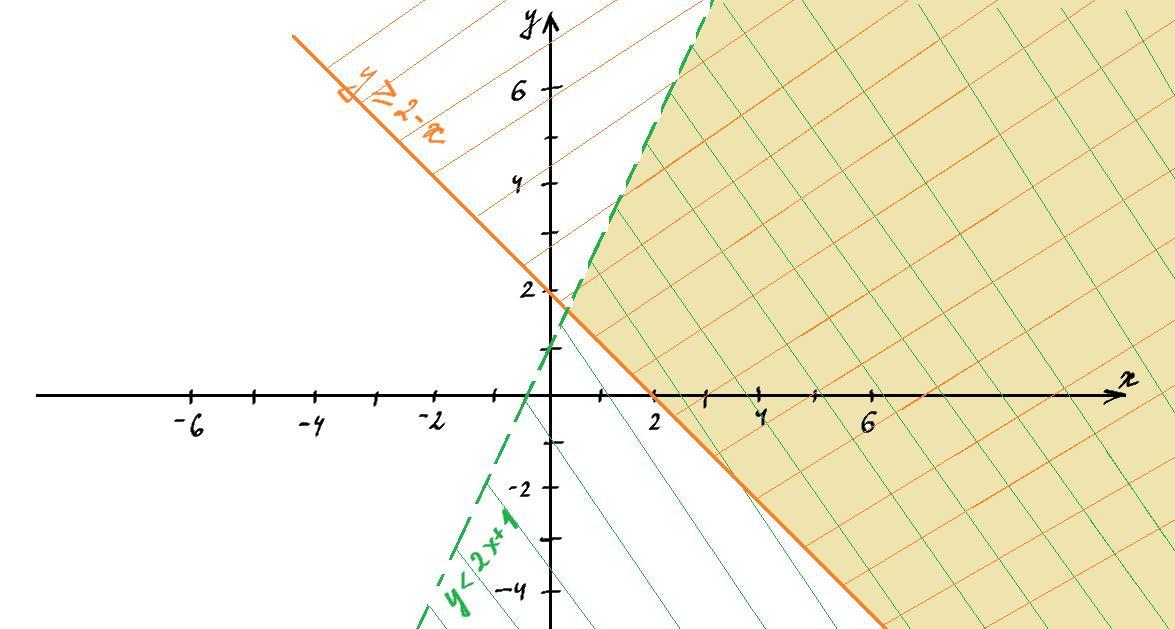 3) Часть плоскости, где штриховка пересекается и есть решение данной системы неравенств. На рисунке она выделена бежевым цветом.
