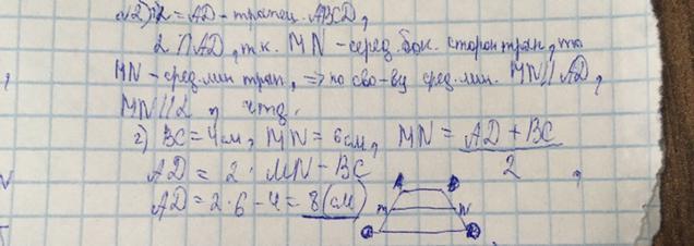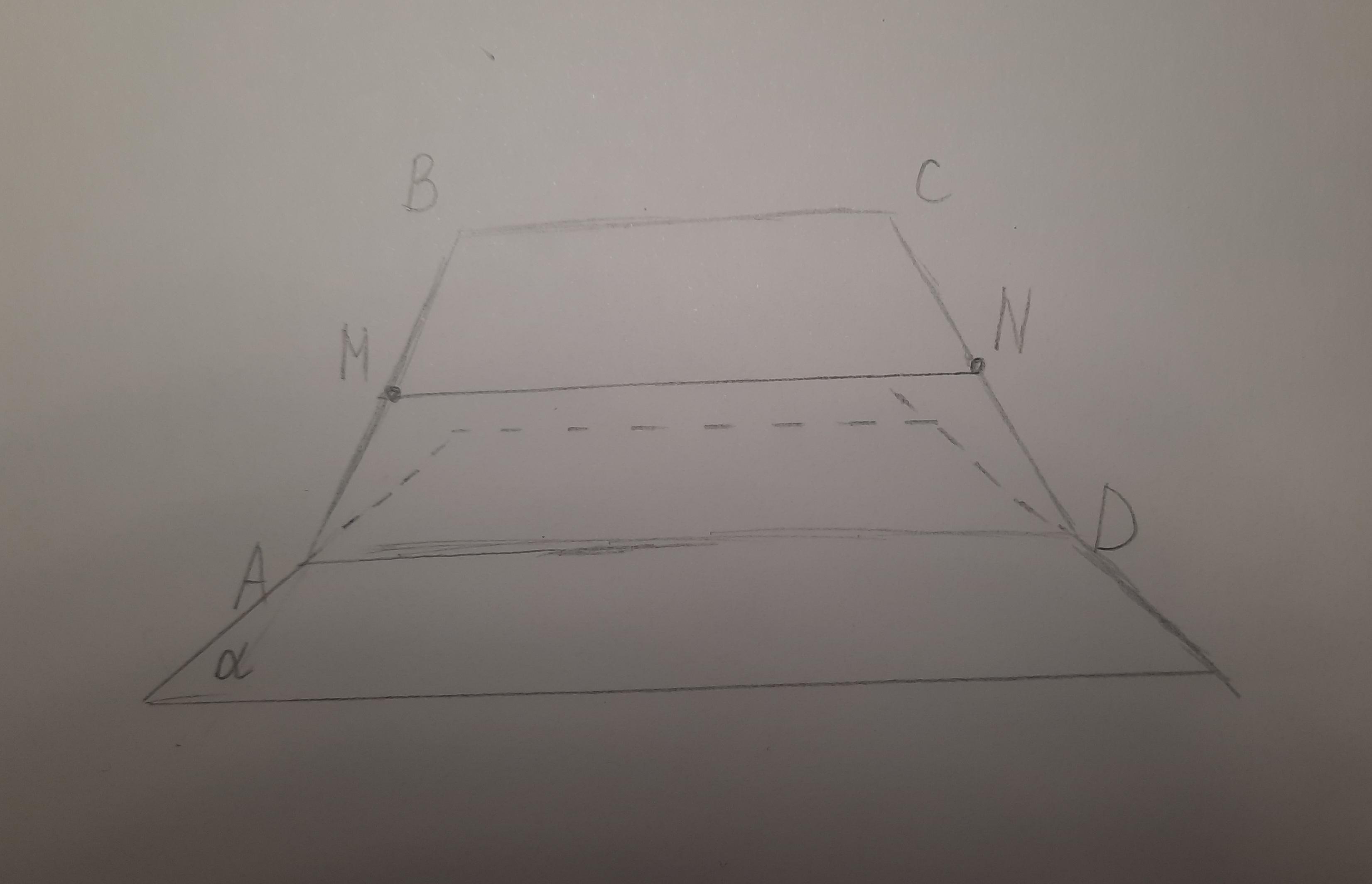 Плоскость проходит через основание AD трапеции ABCD, M и N середины боковых сторон трапеции a)докажите что MN// альфe