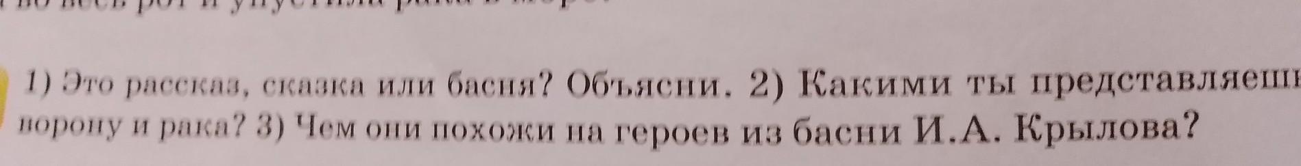 Ворона и Рак 1) Это рассказ, сказка или басня? Объясни. 2) Какими ты представляешь ворону и рака? 3) Чем они похожи на героев из басни И.А. Крылова?