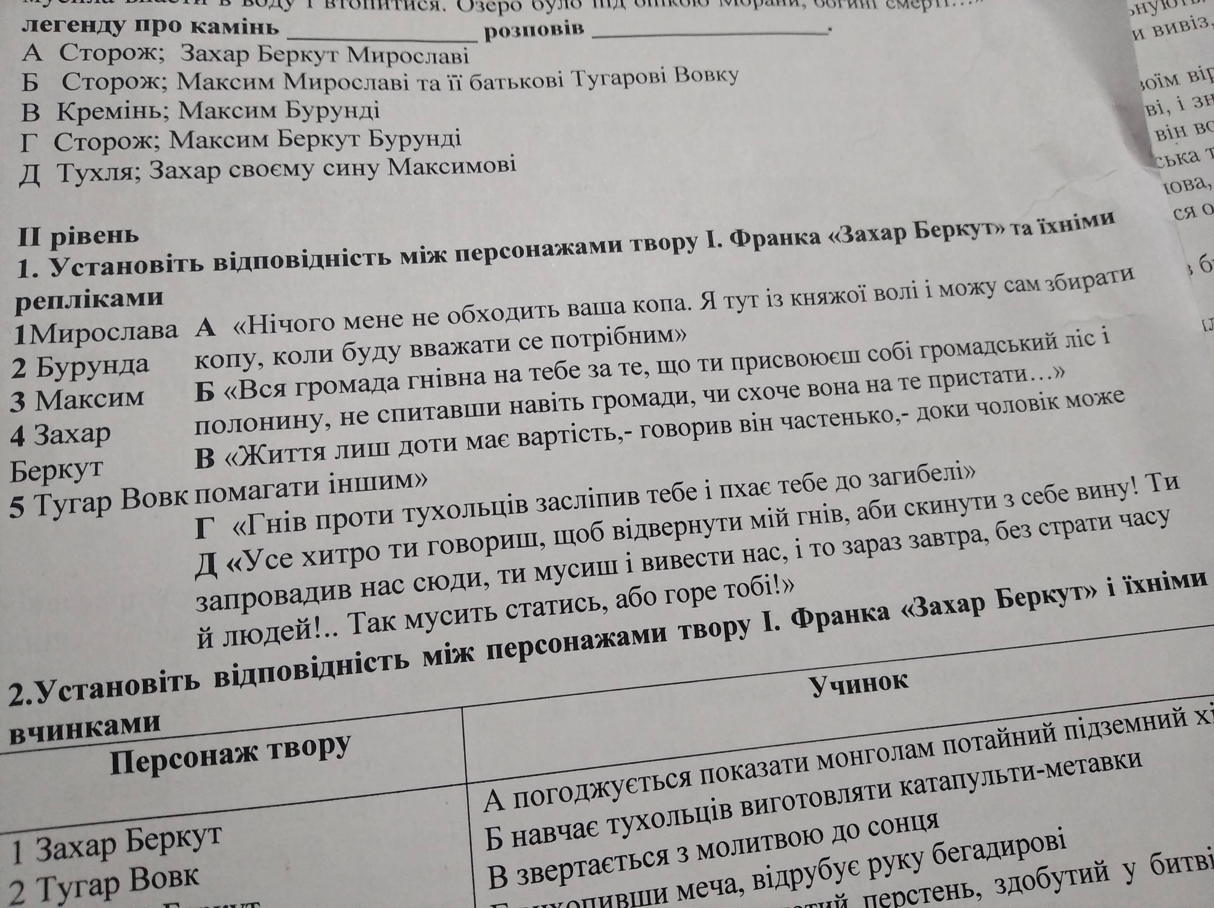 Установіть відповідність між персонажами твору І. Франка " Захар Беркут" та їхніми репліками