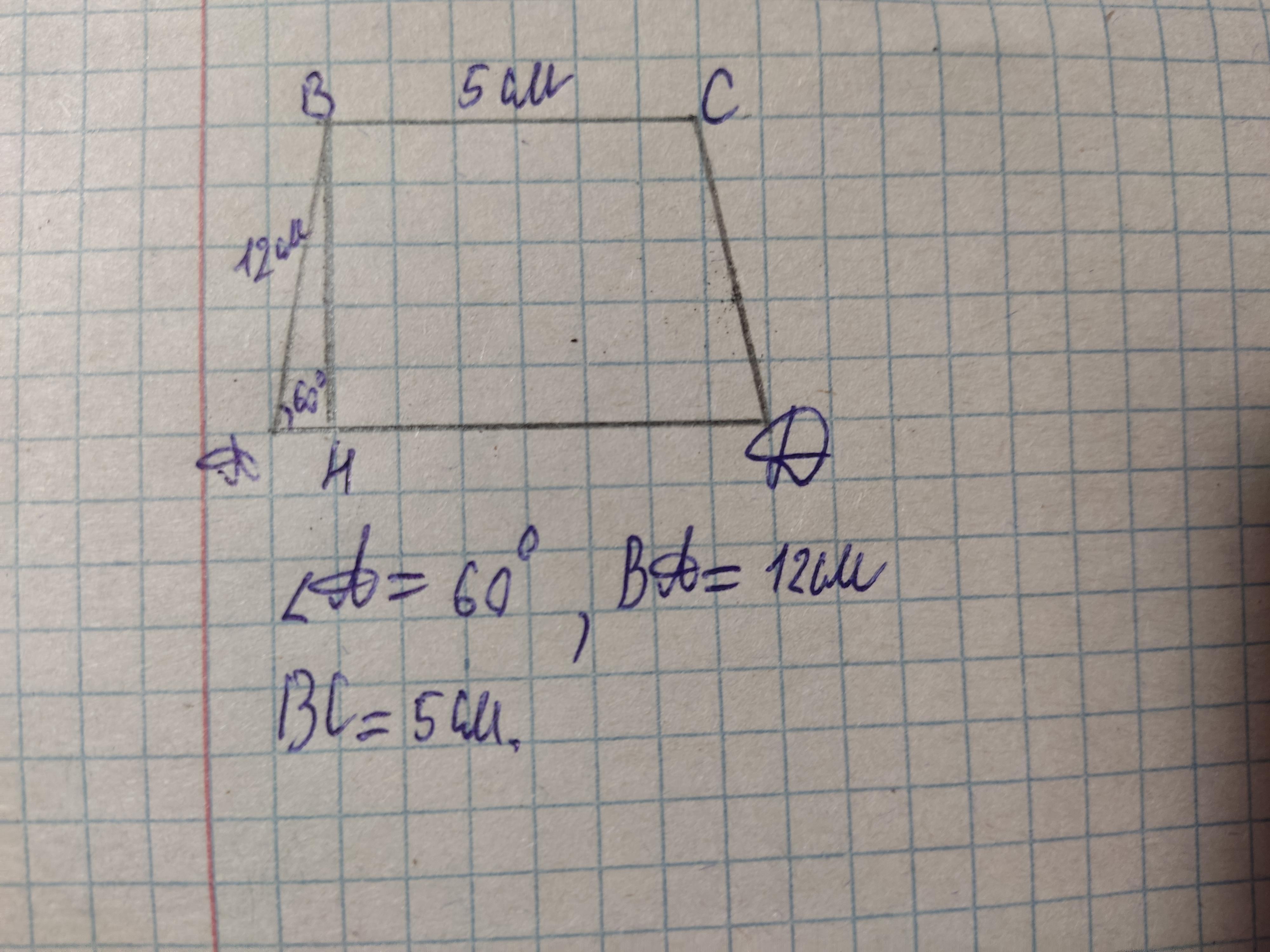 Проведём высоту ВН, нам надо найти AD, для этого нам надо найти AH, если угол А = 60°, угол Н=90° => 180°-(60°+90°) =30°, угол В = 30°, АH=12÷2=6см (по свойству прямоугольного треугольника) АD=2•6+5=17см, средняя линия находится по формуле м=(а+b)/2, где м-средняя линия, а-меньшее основание, b-большее основание=> средняя линия =(5+17)/2=11 см