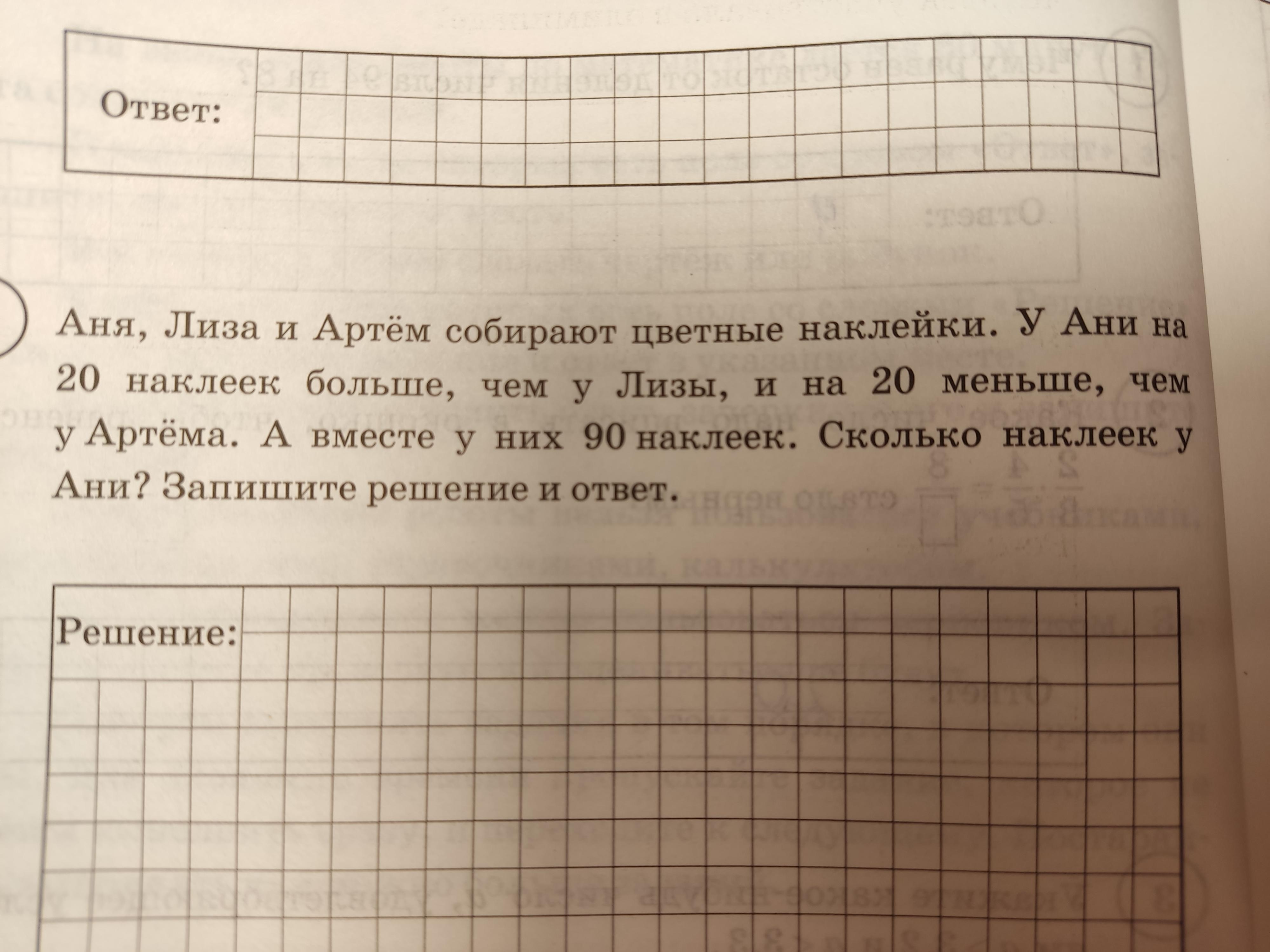 Составим уравнение (х+20)+х+(х+40)=90. 3х+60=90. 3х=30. х=10-наклеек у Лизы. 10+20=30 наклеек у Ани.