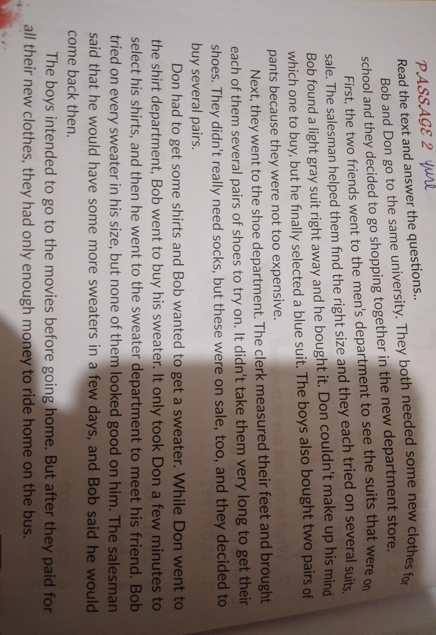 1. Why did Bob and Don need new clothes for so school 2. What did the salesman do? 3. Why did they buy two pairs of pants? 4. What else did Bob and Don buy? 5. Why didn't Bob buy a sweater? 5. What did the boys want to do before going home? How much money did they have after they paid for all the clothes?