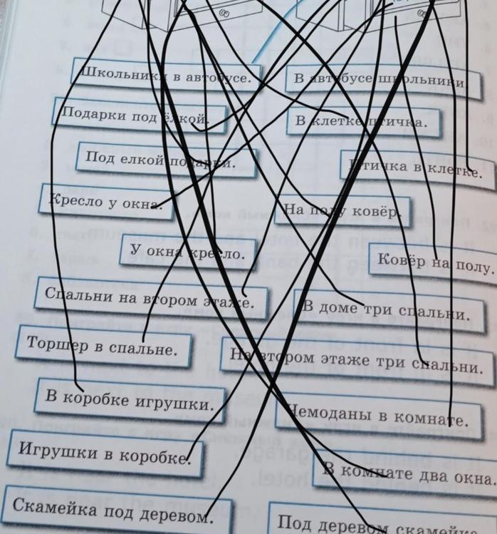 Подарки под ёлкой-под ёлкой подарки,в клетке птичка-птичка в клетке,кресло у окна-у окна кресло,ковёр на полу-на полу ковёр,спальни на втором этаже на втором этаже 3 спальни
