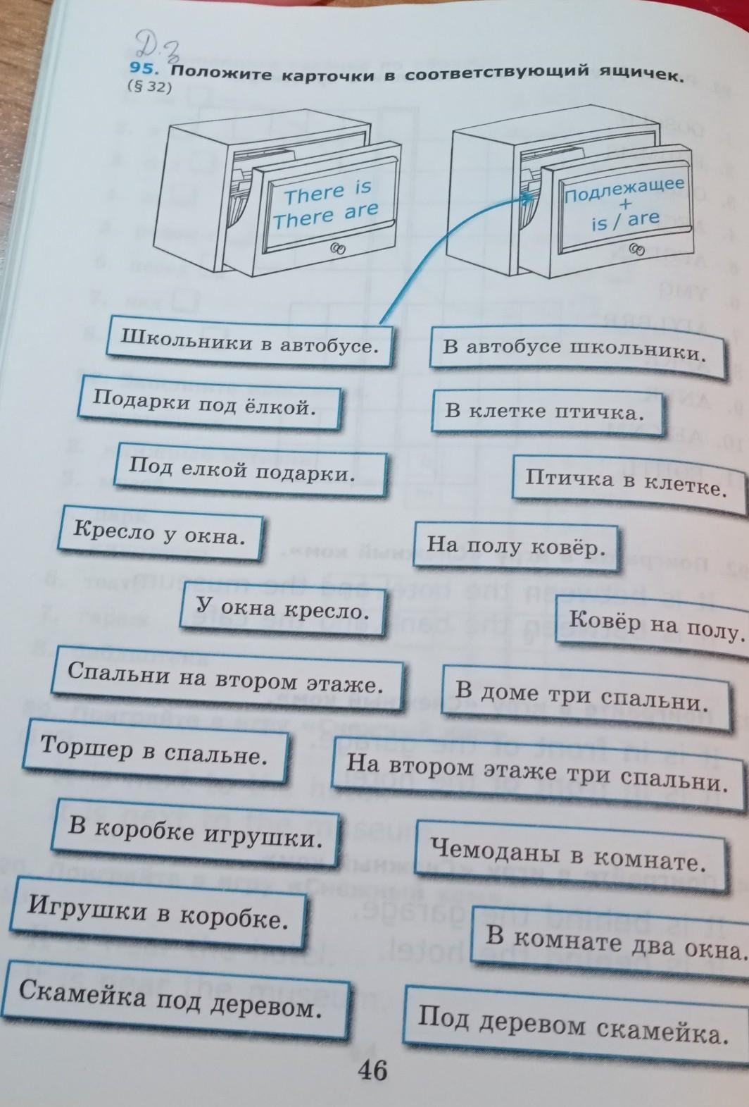 95. Положите карточки в соответствующий ящичек. (8 32) Ф 96 There is There are + Подлежащее is / are Школьники в автобусе. В автобусе школьники, Подарки под ёлкой. В клетке птичка. Под елкой подарки. Птичка в клетке, Кресло у окна. На полу ковёр. У окна кресло. Ковёр на полу. Спальни на втором этаже. В доме три спальни. Торшер в спальне. На втором этаже три спальни. В коробке игрушки. Чемоданы в комнате. Игрушки в коробке. В комнате два окна. Скамейка под деревом. Под деревом скамейка.