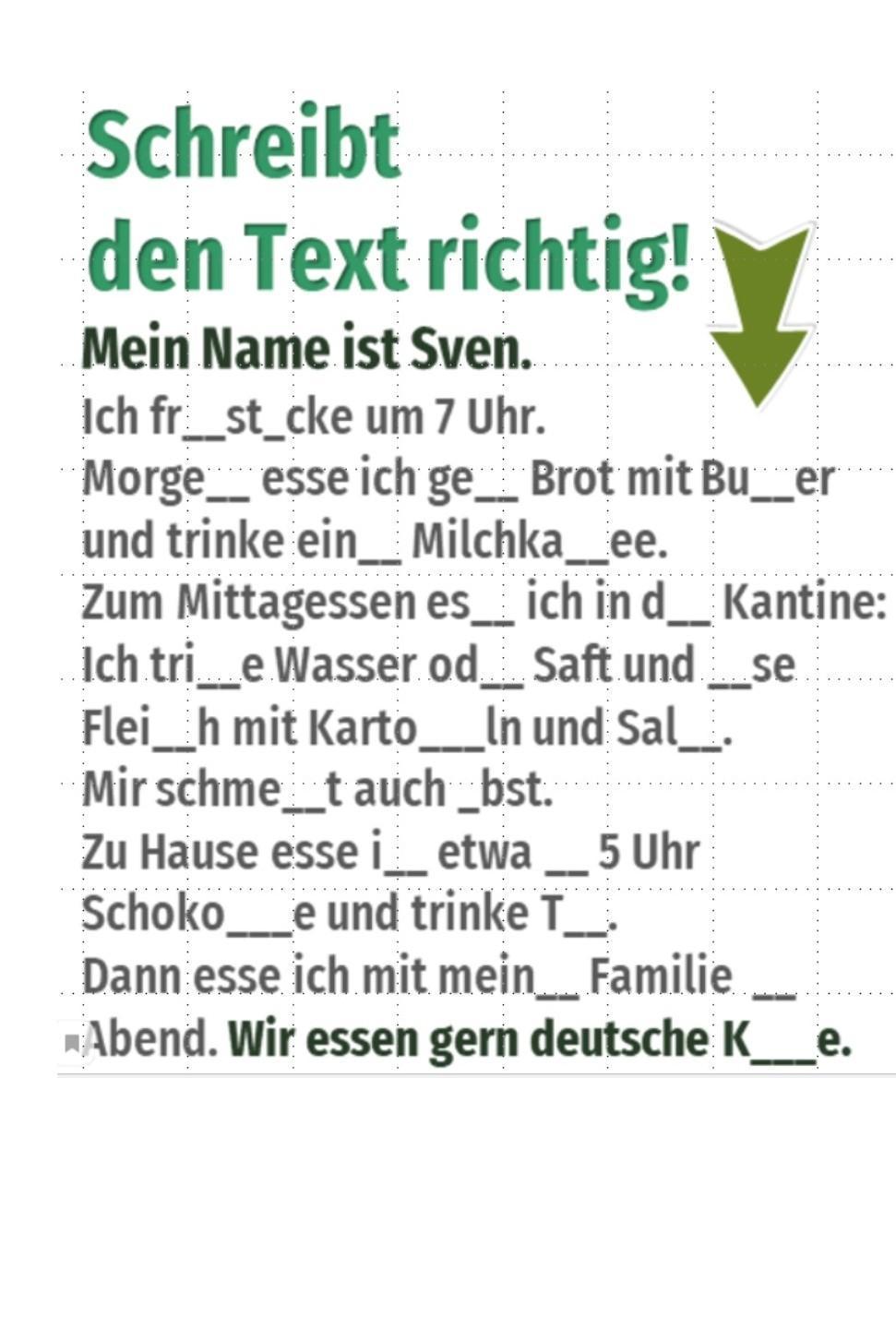 frühstücke, Morgen, gern, Butter, einen Milchkaffee, esse, der, trinke, oder, esse, Fleisch, Kartoffeln, Salat, schmeckt, Obst, ich, etwas, Schokolade, Tee, meiner