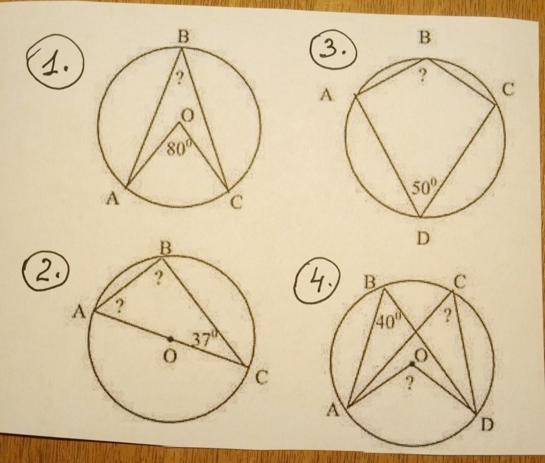 1) <B = 40°. 2) <B= 90°;<A=53°. 3)100°. 4)<ACD=40°;<AOD=80°