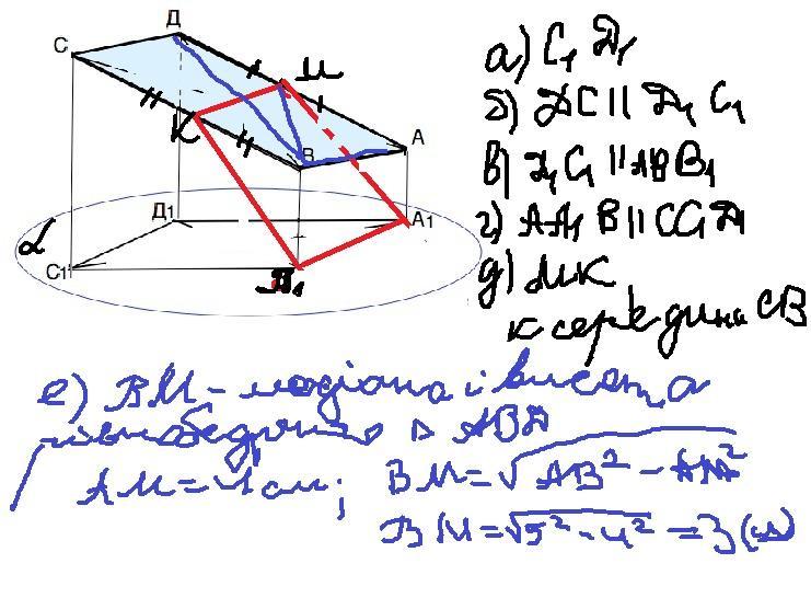 д) Побудуйте лінію перетину площини АВС з площиною, яка проходить через середину М сторони AD і пряму А1В1 ;