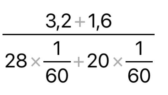 V=(3,2км+1,6км)/((28*1/60 ч)+(20*1/60 ч))