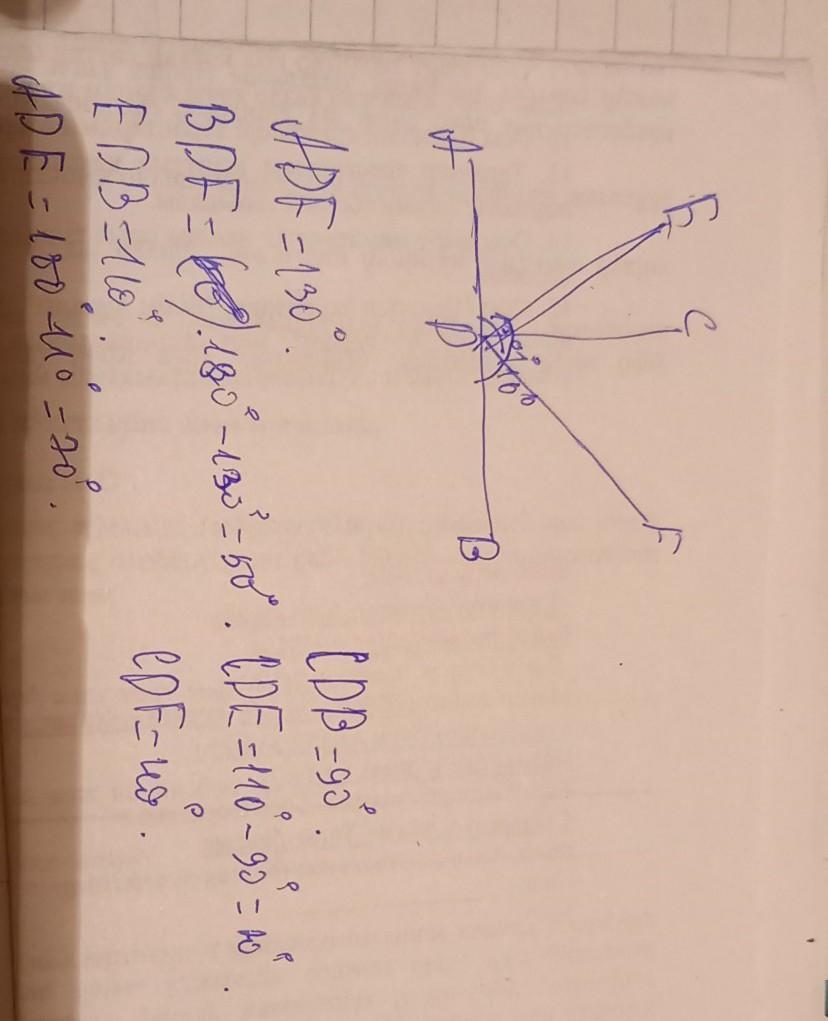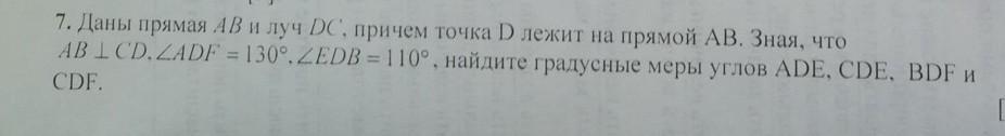 7. Даны прямая АВ и луч DC, причем точка D лежит на прямой АВ. Зная, что AB L CD, АDF = 130°.<EDB=110°. найдите градусные меры углов ADE, CDE, BDF и CDF.