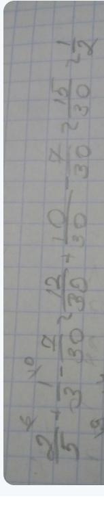 2/5 +1/3 -7/30 = 2×6/30 + 1×10/30 - 7×1 /30 = 12/30 + 10/30 - 7/30 = 15/30 = 1/2