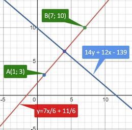 уравнение прямой, все точки которой находятся на равных расстояниях от точек A(1;3) и B(7;10) имеет вид 14у + 12х -139 = 0
