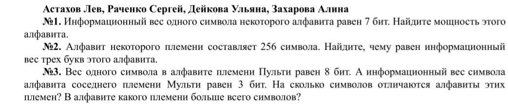 Информационный объем символа племени Мульти i₂ = 3 бита, тогда мощность алфавита N₂=2³=8