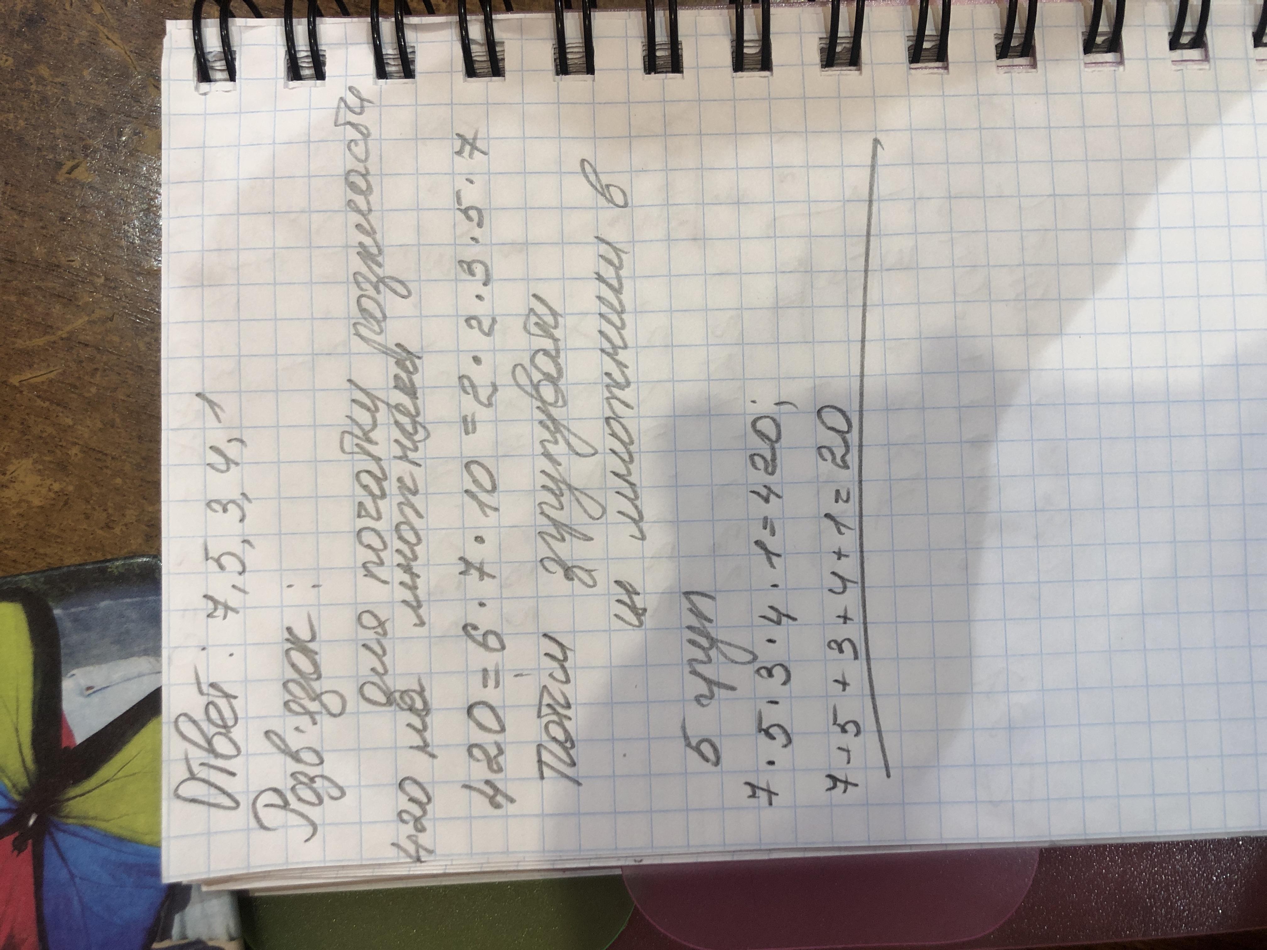 Вкажіть п‘ять цілих додатних числа, сума яких дорівнює 20, а добуток дорівнює 420