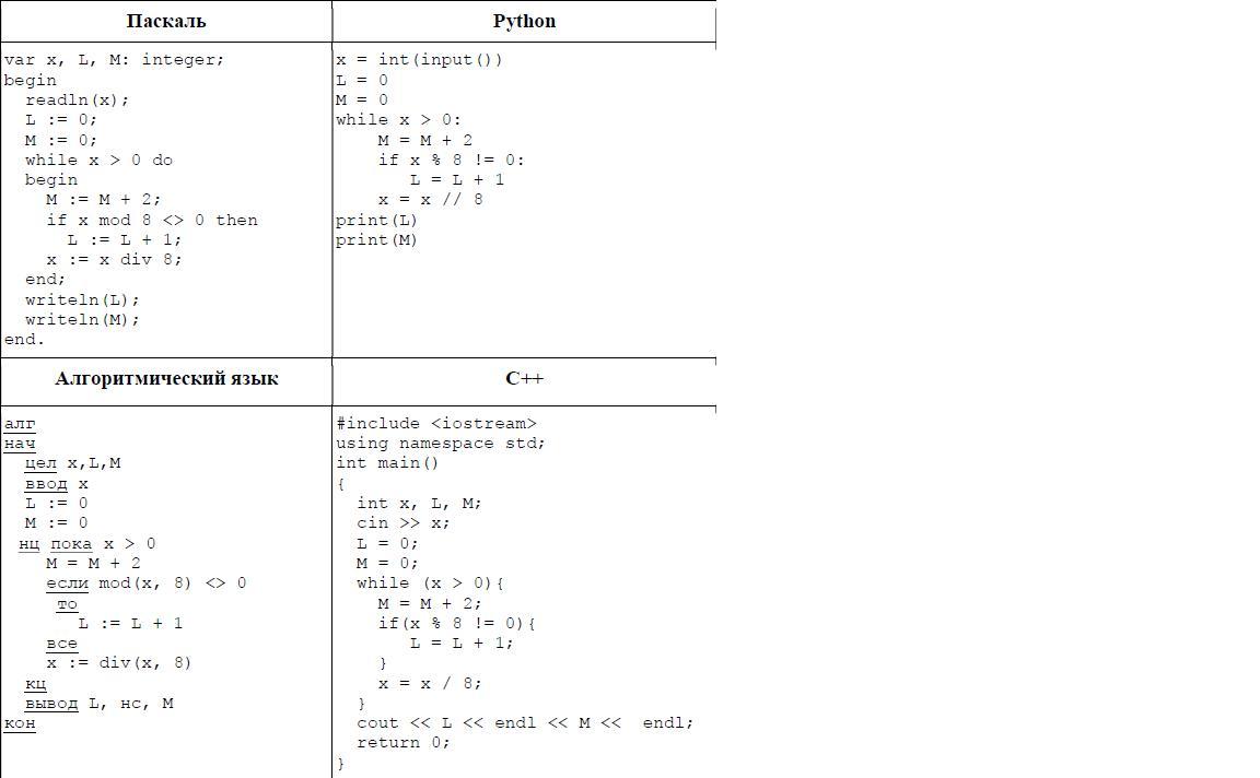 Ниже на четырёх языках программирования записан алгоритм. Получив на вход число x, этот алгоритм печатает два числа: L и M. Укажите наименьшее число x, при вводе которого алгоритм печатает сначала 2, а потом 6.