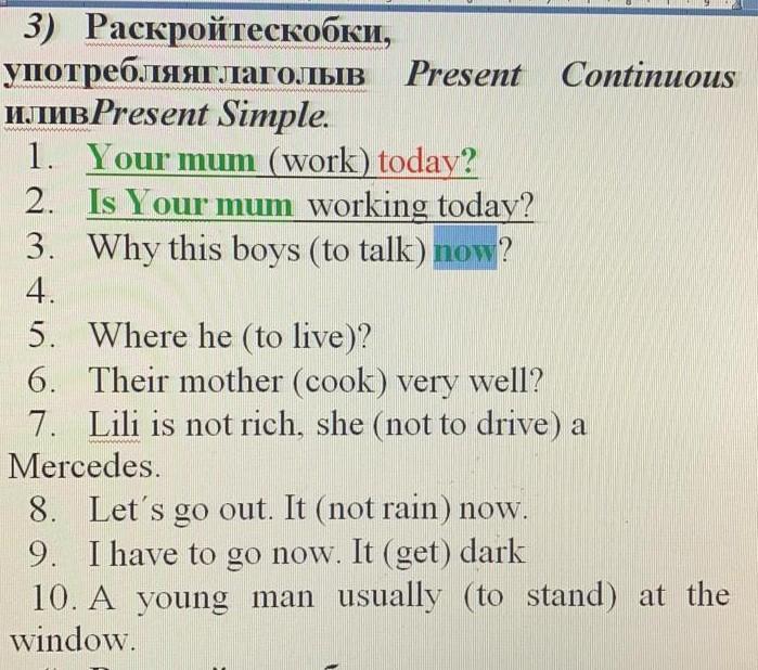 1. your mum wurking today? 2. Is your working today? 3. Why this boys to talking now? 5. Where he to living? 6. Their mother cooking very well?