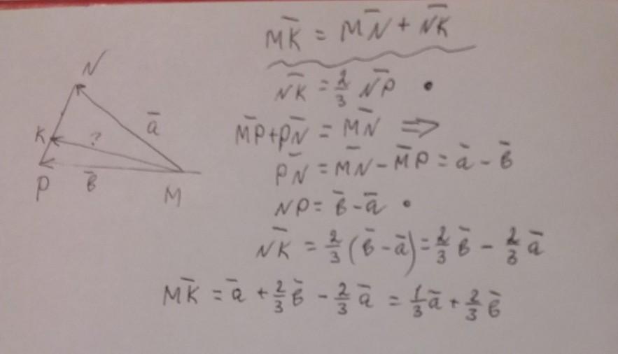 В треугольнике MNP на стороне NP отмечена точка K так, что делит по отношении NK:KP=3:2 Выразите MK по векторам a и b если векторы MN=a MP=b. С объяснением и с рисунком пожалуйста.