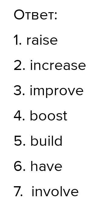 1 When I want to ___ my mood, I go running. 2 Did you know laughing can pressure? 3 My dad doesn't __ the discipline to run a marathon 4 She's very shy. I think she needs help to her self-esteem. 5 Coffee doesn't your energy for very long. It gives a short boost. 6 Our new project – a lot of team work. 7 There are exercises you can do to — your concentration, -