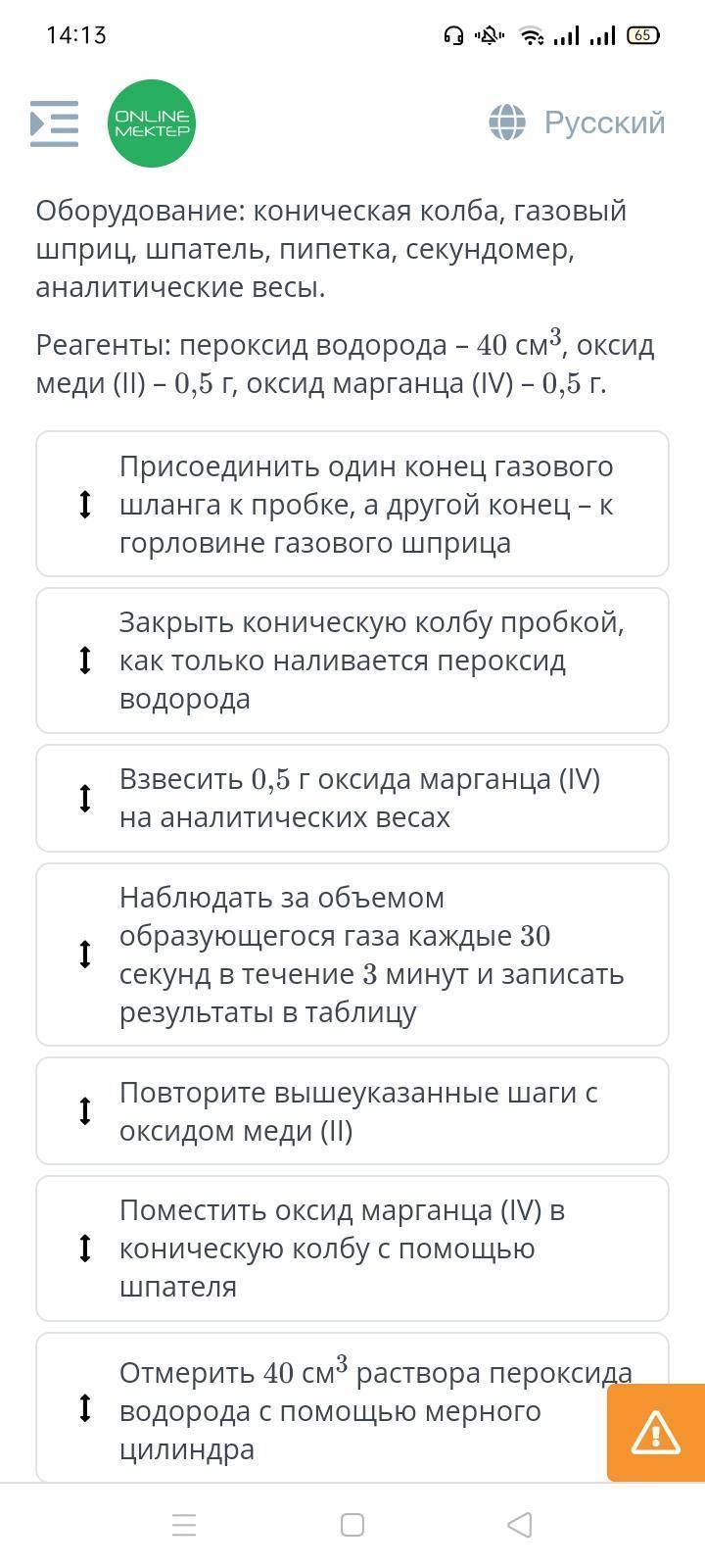 Ученик разработал план исследований с использованием экспериментального оборудования и реагентов для изучения влияния различных катализаторов на скорость разложения пероксида водорода. Расположи план ученика в правильном порядке