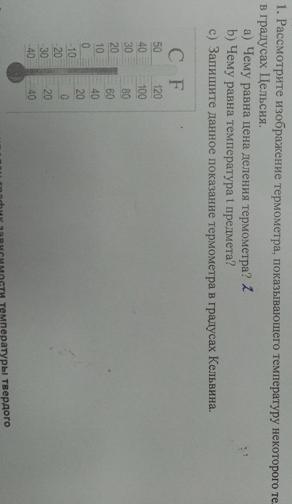 1. Рассмотрите изображение термометра, показывающего температуру некоторого тела в градусах Цельсия. а) Чему равна цена деления термометра? b) Чему равна температура t предмета? c) Запишите данное показание термометра в градусах Кельвина. 11 [1 [! CF Запишите
