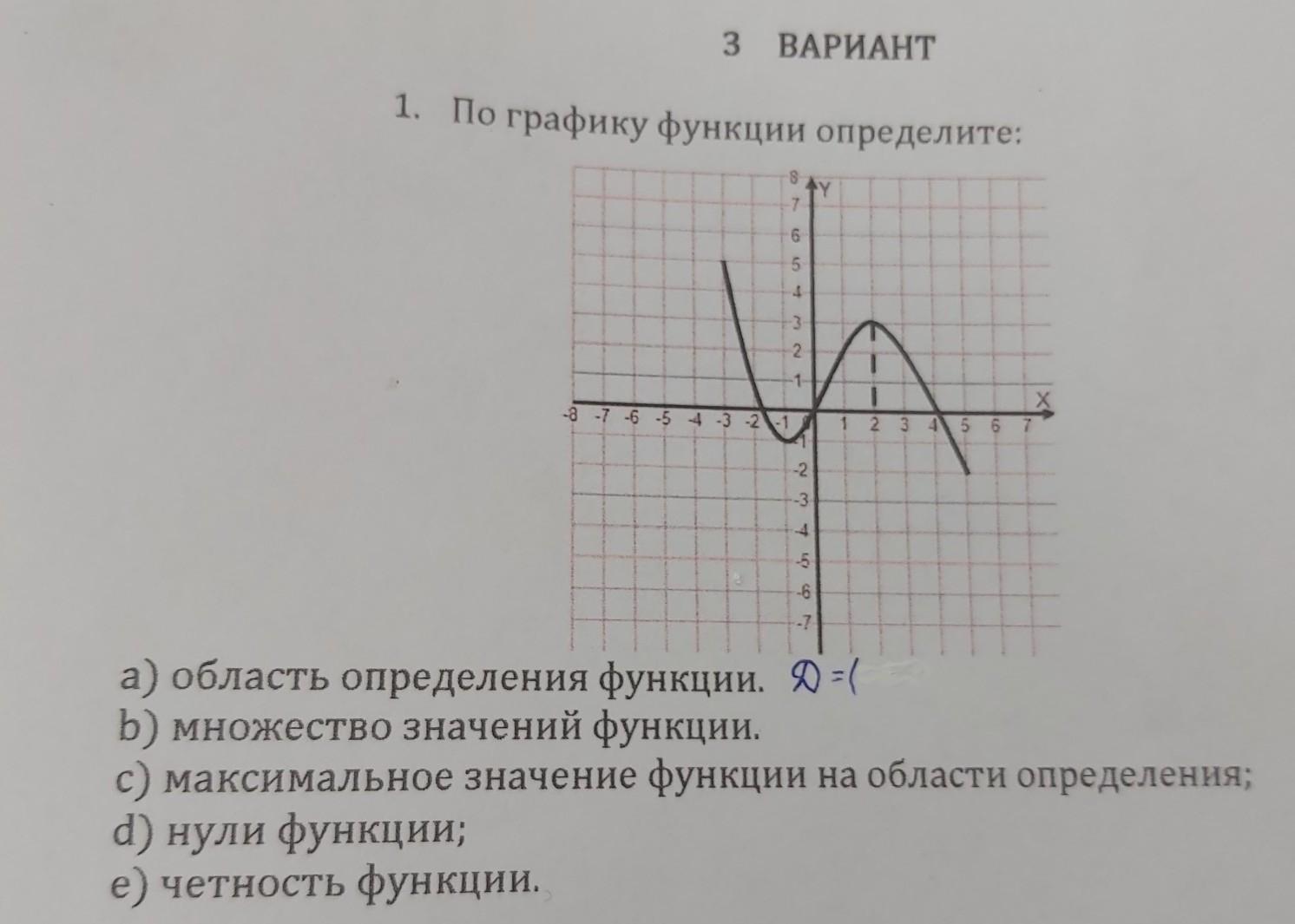 d) нули функции: нули функции - это значения аргумента, при которых функция равна нулю. На графике это абсциссы точек, в которых график функции пересекает ось Ох: ≈ - 1,8; 0; 4.